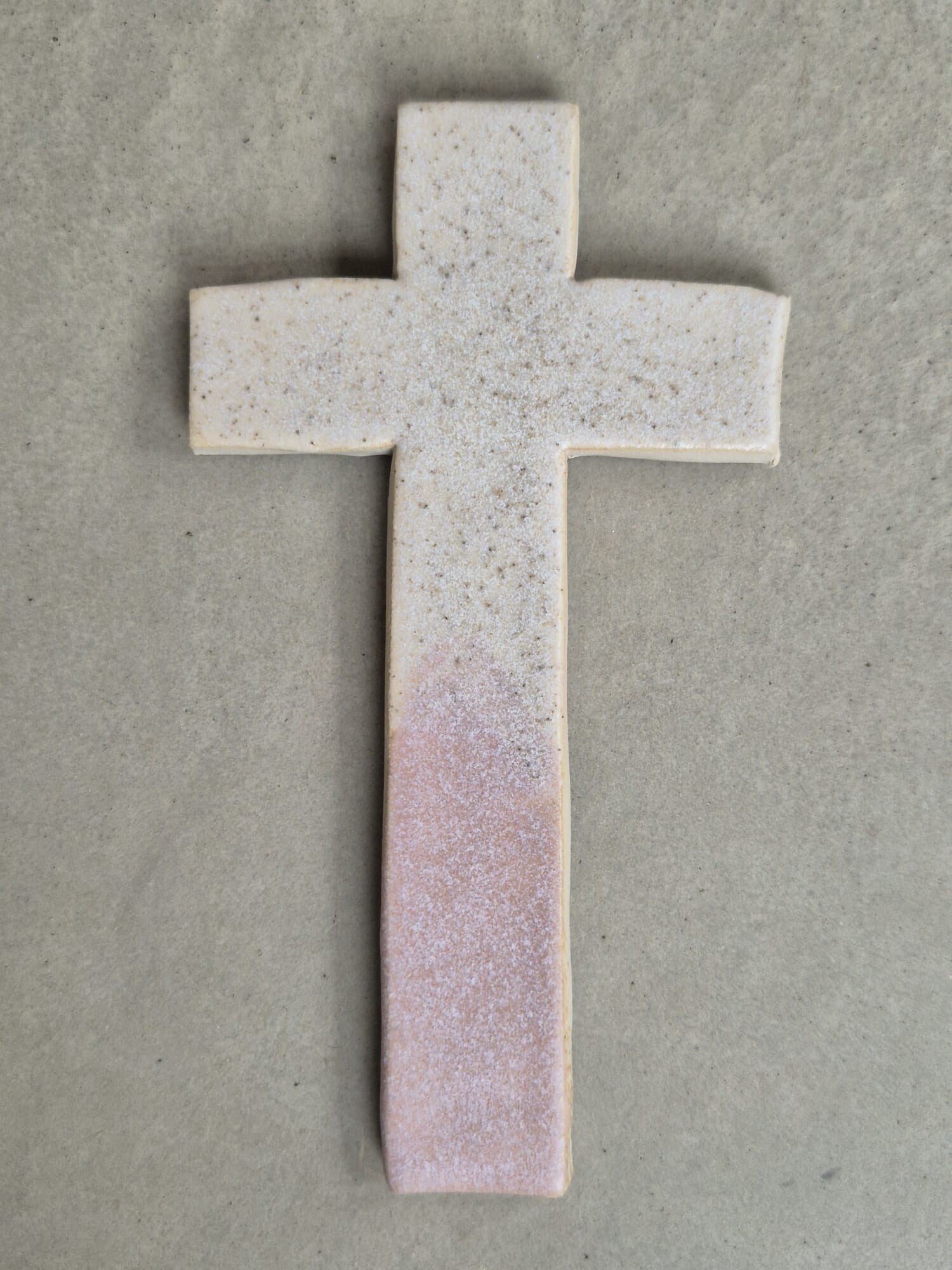 Uniek handgemaakt kruisje van keramiek. Er zit een haakje aan waardoor het mogelijk is het kruisje op te hangen.