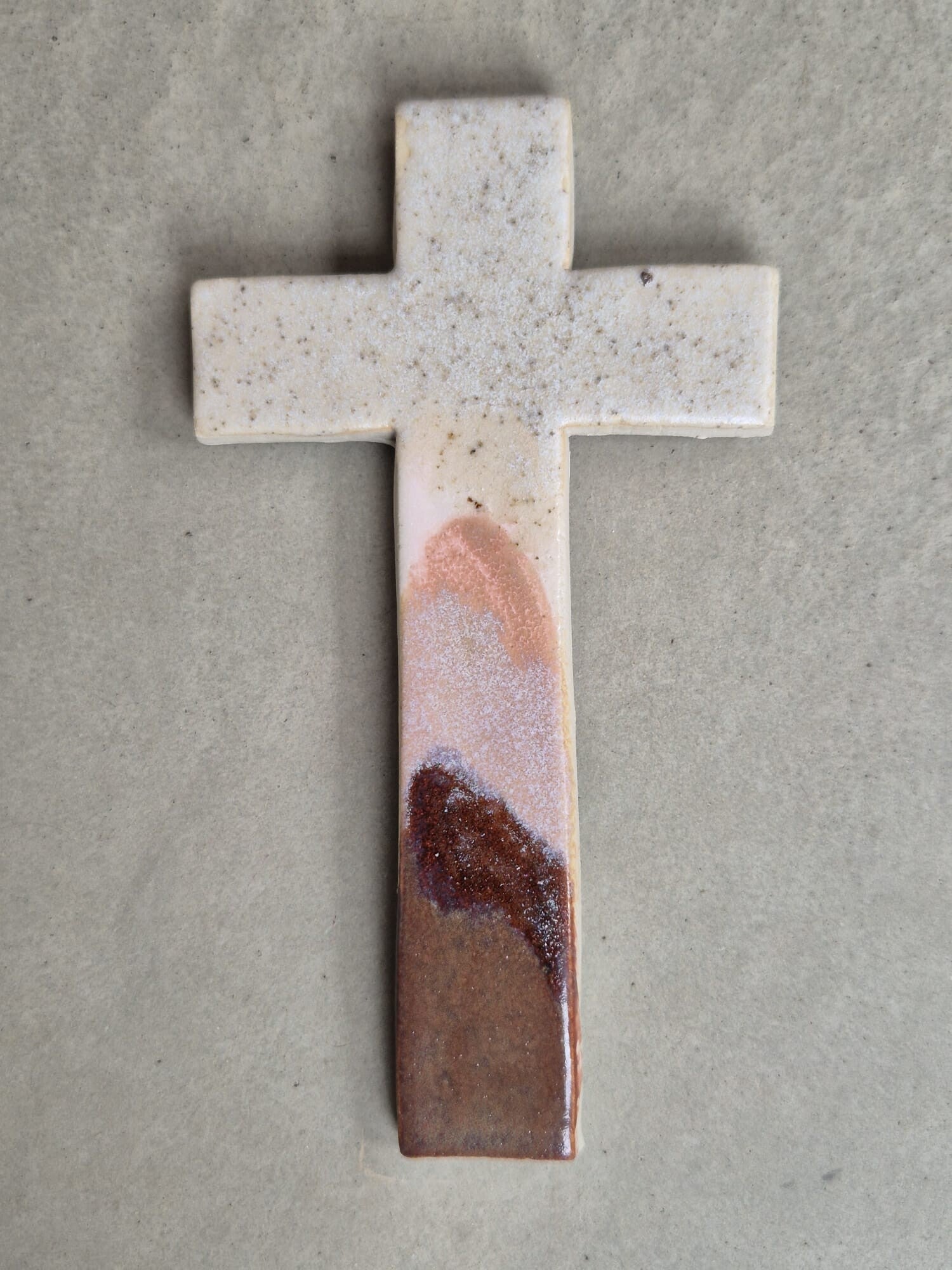 Uniek handgemaakt kruisje van keramiek. Er zit een haakje aan waardoor het mogelijk is het kruisje op te hangen.
