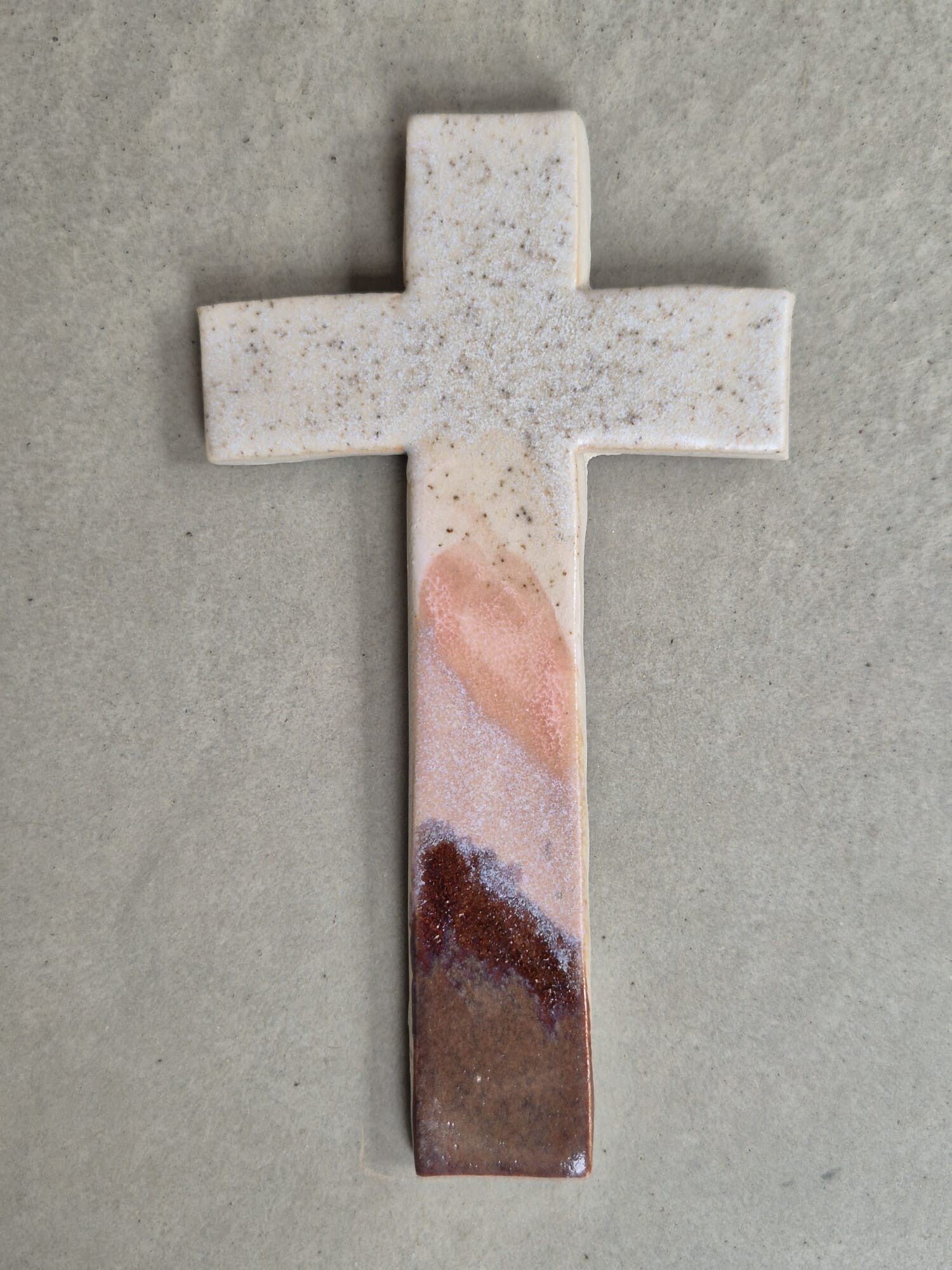 Uniek handgemaakt kruisje van keramiek. Er zit een haakje aan waardoor het mogelijk is het kruisje op te hangen.
