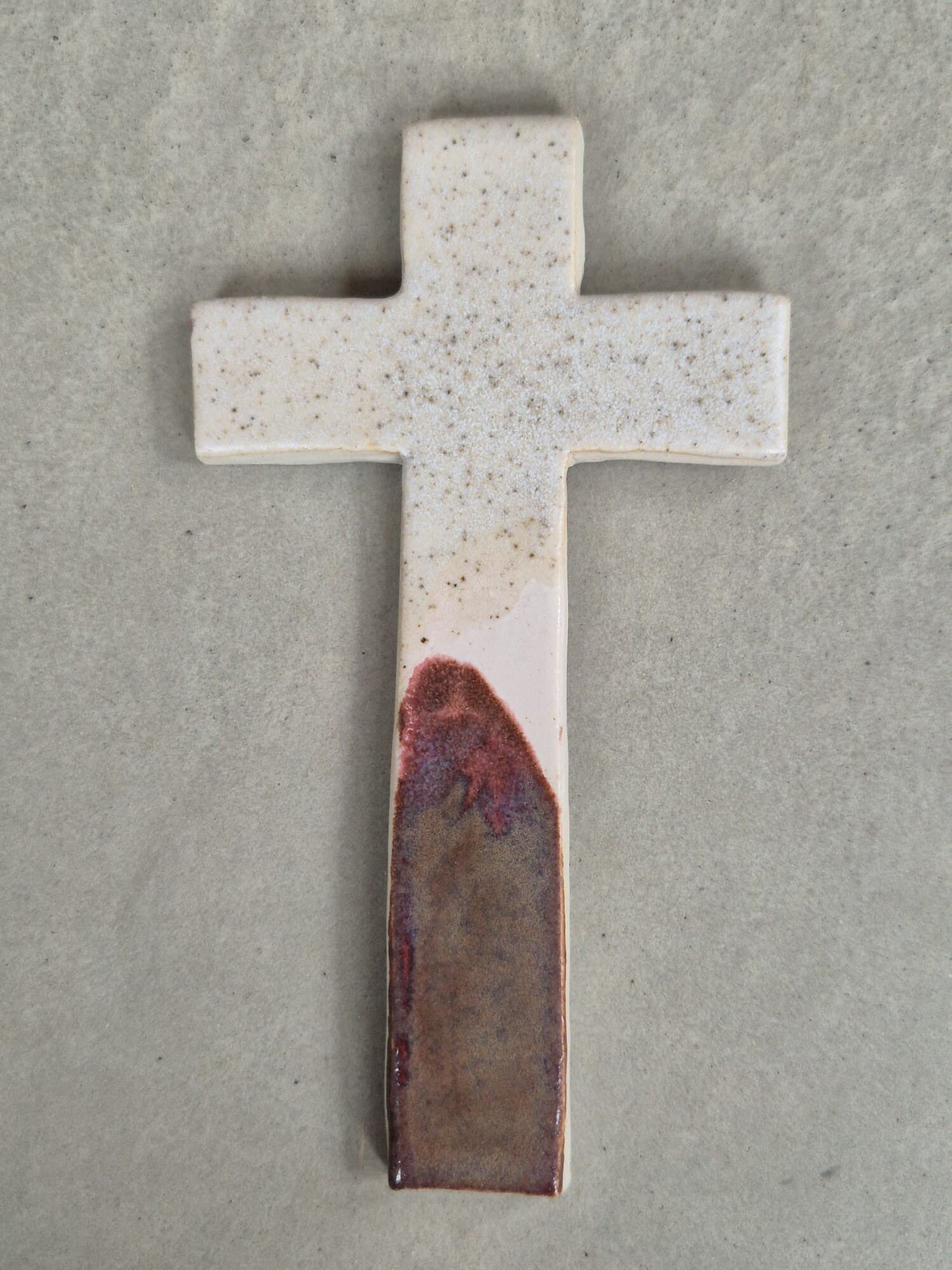 Uniek handgemaakt kruisje van keramiek. Er zit een haakje aan waardoor het mogelijk is het kruisje op te hangen.