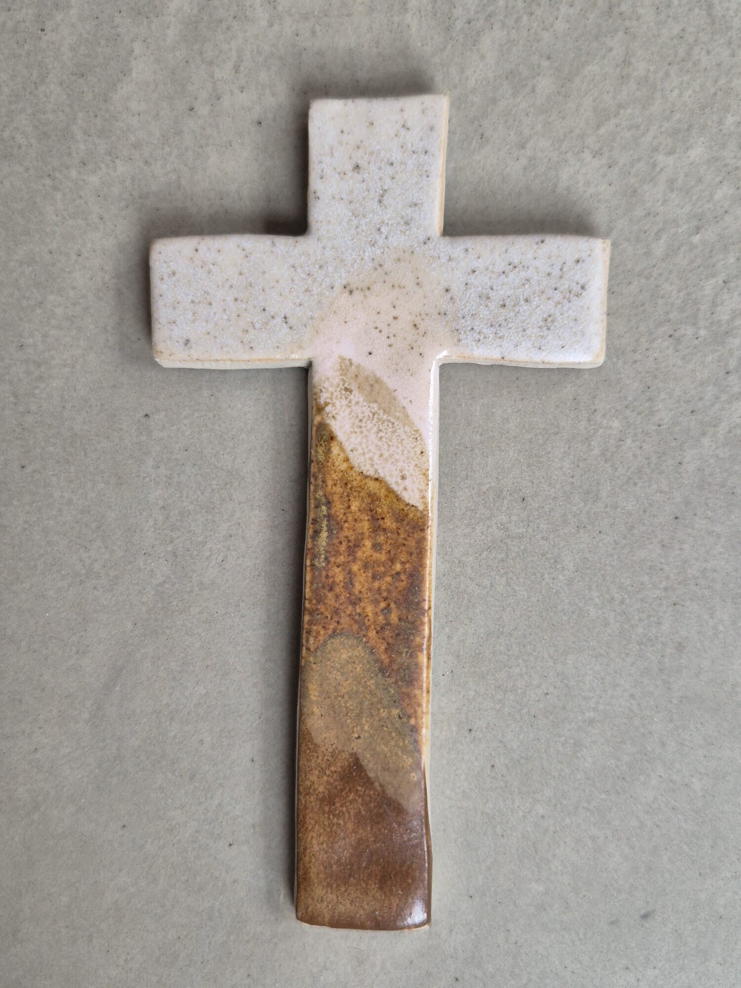 Uniek handgemaakt kruisje van keramiek. Er zit een haakje aan waardoor het mogelijk is het kruisje op te hangen.