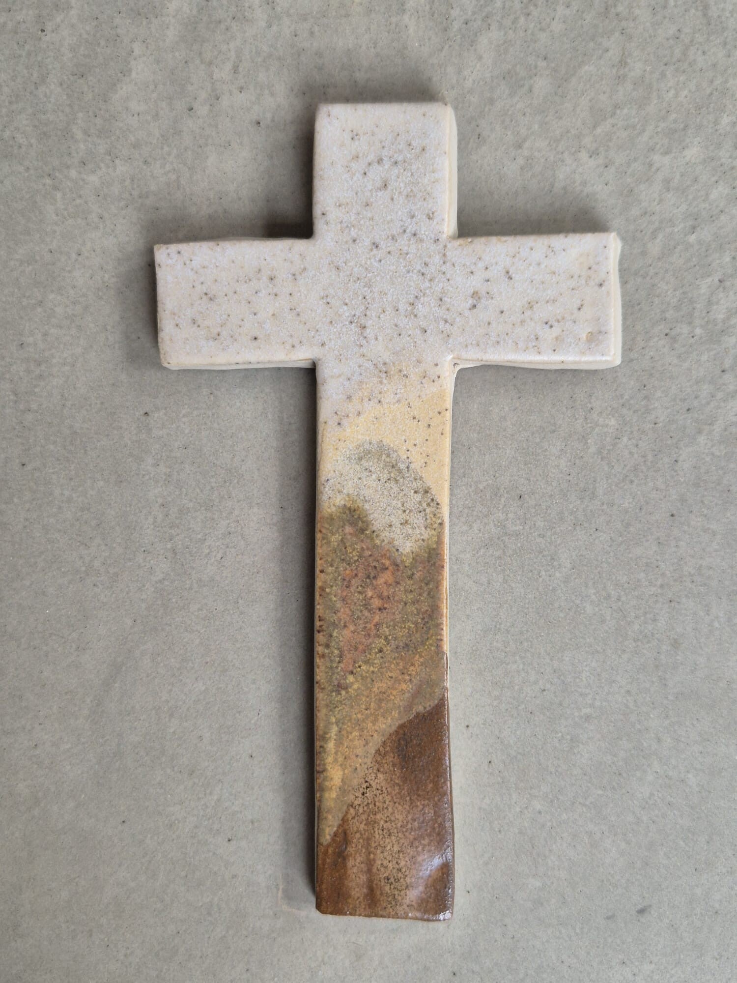 Uniek handgemaakt kruisje van keramiek. Er zit een haakje aan waardoor het mogelijk is het kruisje op te hangen.