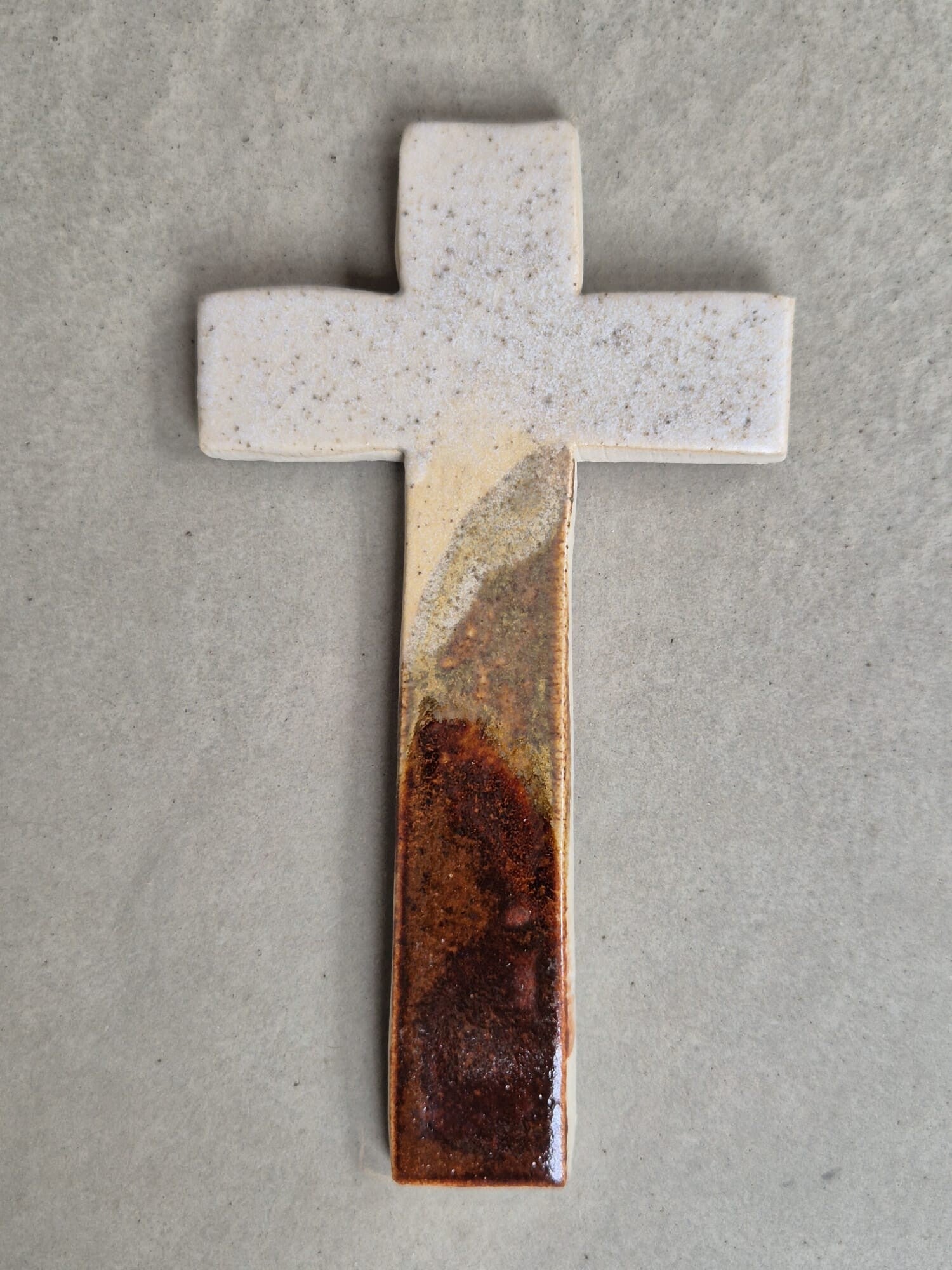 Uniek handgemaakt kruisje van keramiek. Er zit een haakje aan waardoor het mogelijk is het kruisje op te hangen.