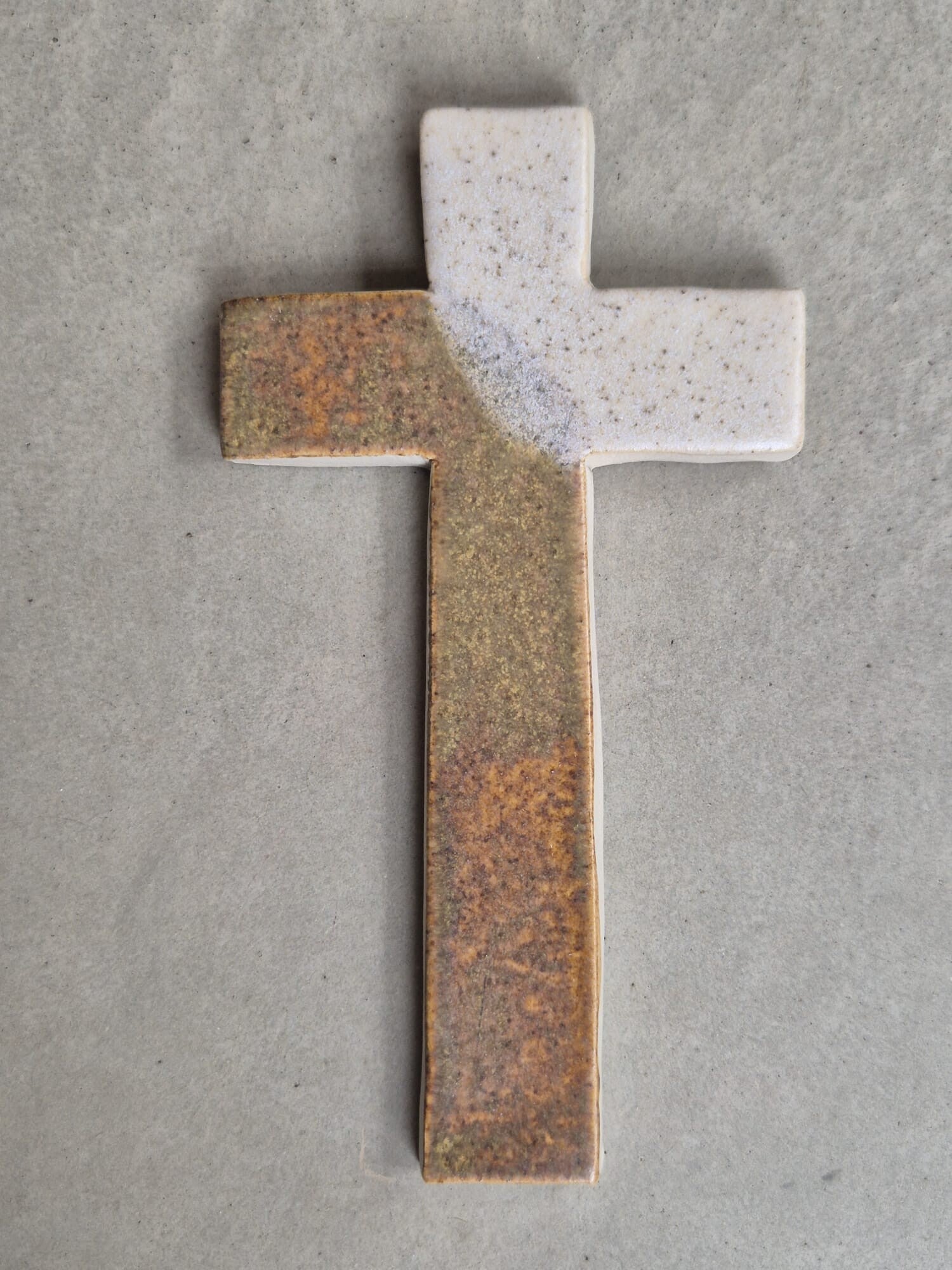Uniek handgemaakt kruisje van keramiek. Er zit een haakje aan waardoor het mogelijk is het kruisje op te hangen.