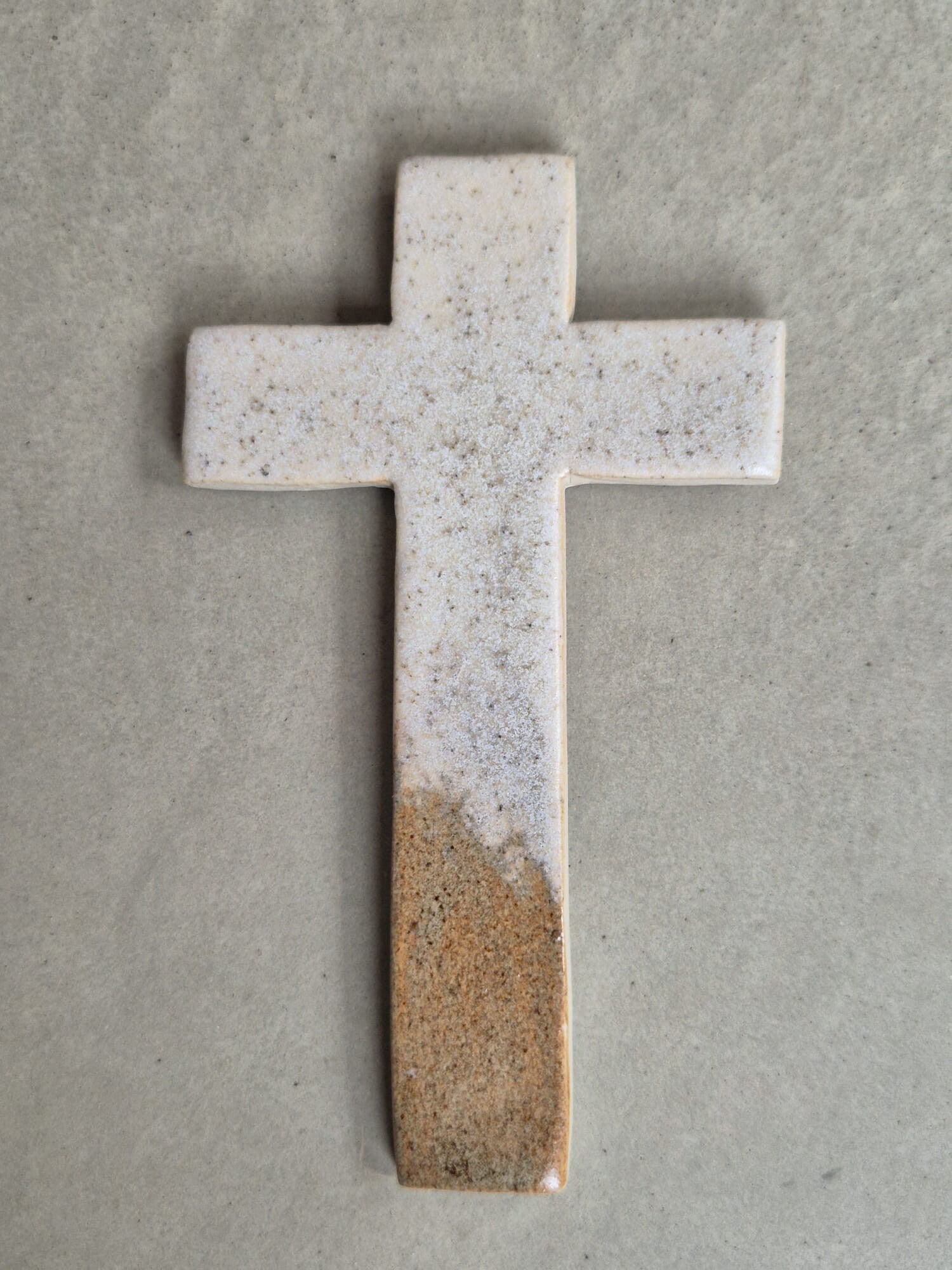 Uniek handgemaakt kruisje van keramiek. Er zit een haakje aan waardoor het mogelijk is het kruisje op te hangen.