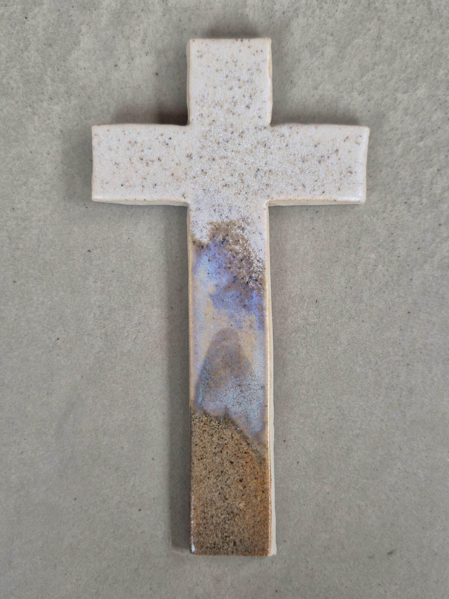 Uniek handgemaakt kruisje van keramiek. Er zit een haakje aan waardoor het mogelijk is het kruisje op te hangen.
