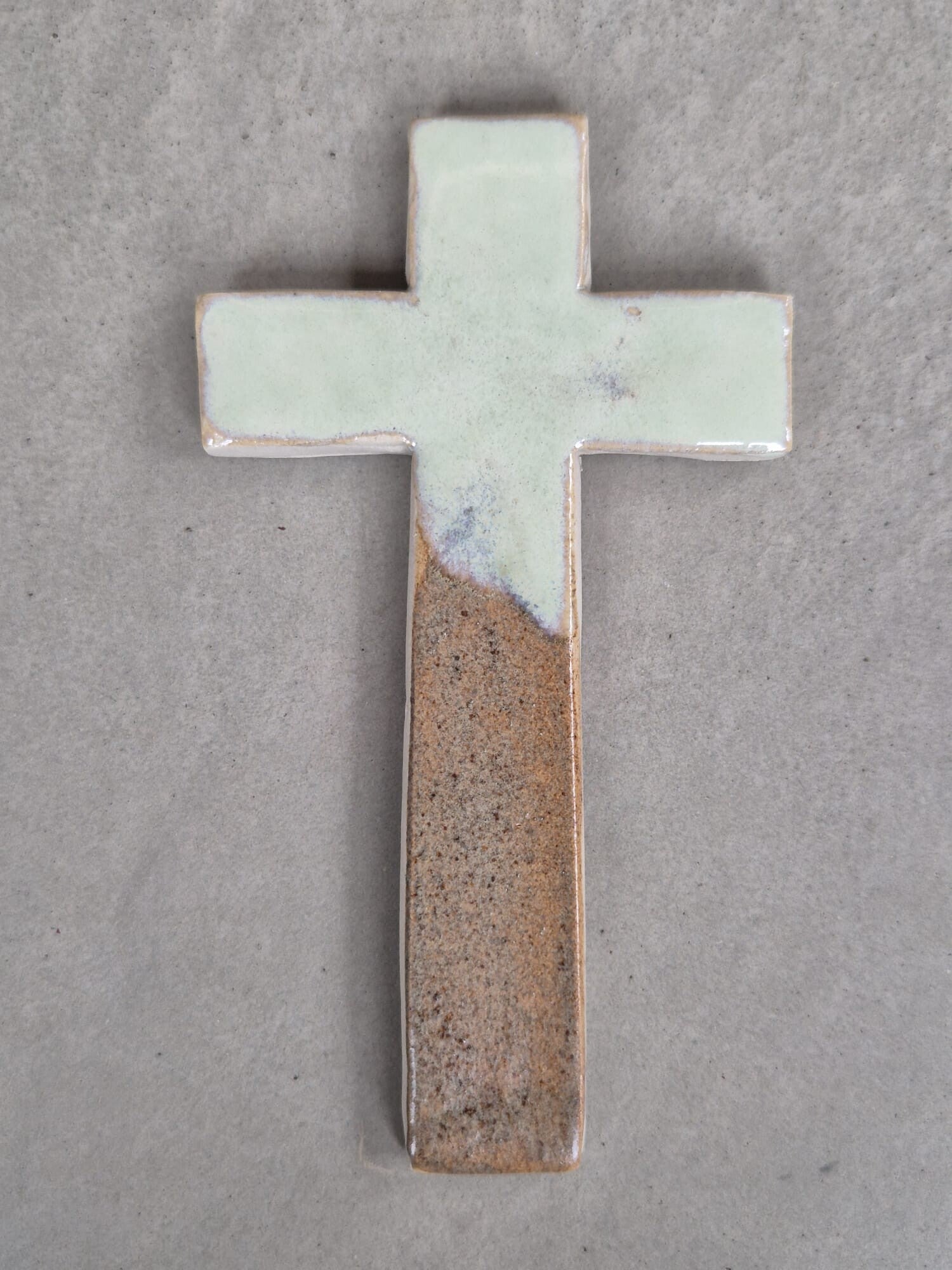 Uniek handgemaakt kruisje van keramiek. Er zit een haakje aan waardoor het mogelijk is het kruisje op te hangen.