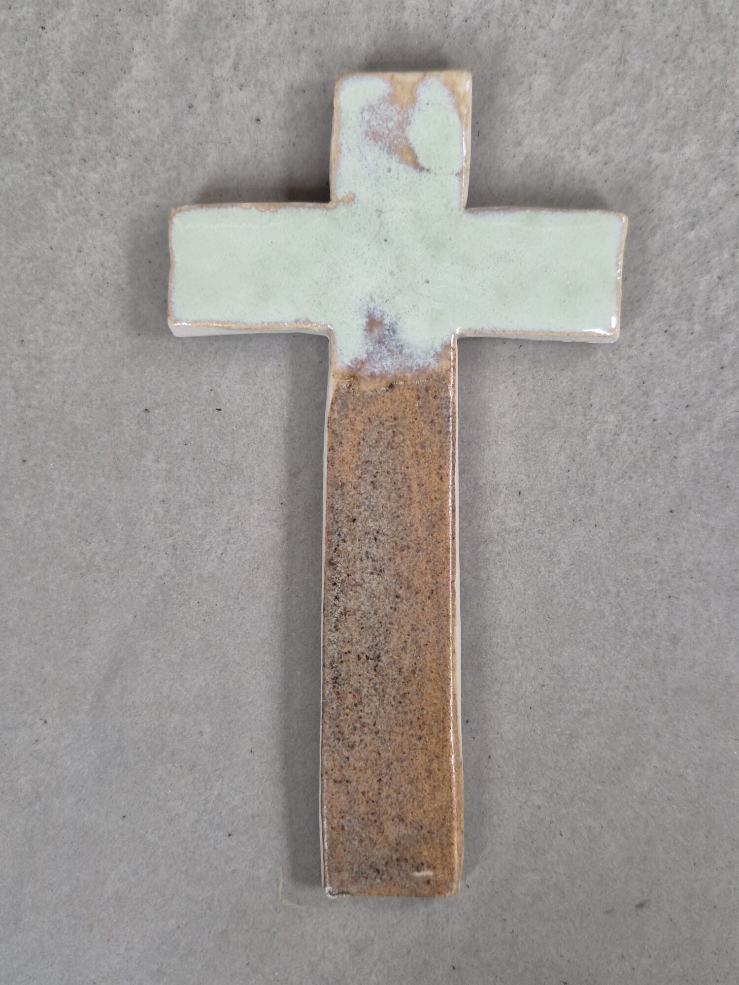 Uniek handgemaakt kruisje van keramiek. Er zit een haakje aan waardoor het mogelijk is het kruisje op te hangen.