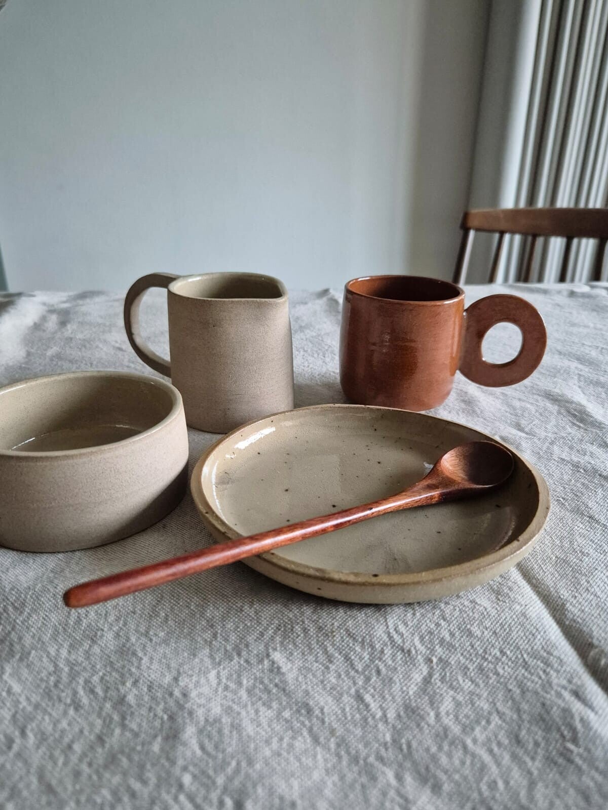 Mini serie, gedraaid met klei in een zachte aardetint. De serie kenmerkt zich door een strakke basis. Het contrast met de grote ronde oren, geeft een speels effect. De buitenkanten zijn ongeglazuurd gelaten waardoor het pure, aardse karakter wordt benadrukt. De binnenkant is geglazuurd met een transparant glazuur.